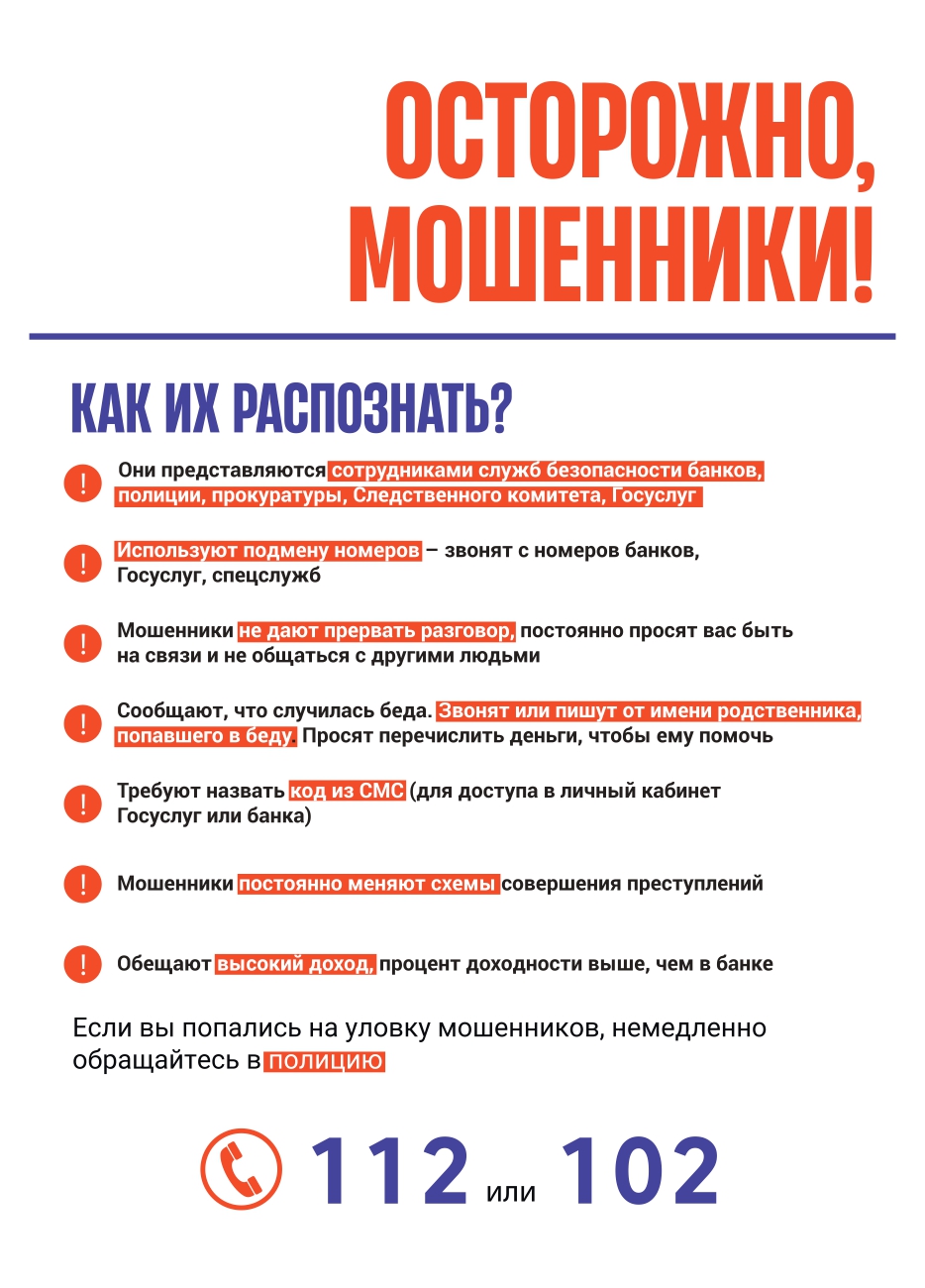 Друзья, будьте осторожны! Не поддавайтесь на уловки мошенников. Поговорите об этом с пожилыми родителями и детьми. Положите трубку, если почувствовали неладное. Позвоните 112 или 102, если вы попались на уловки мошенников.