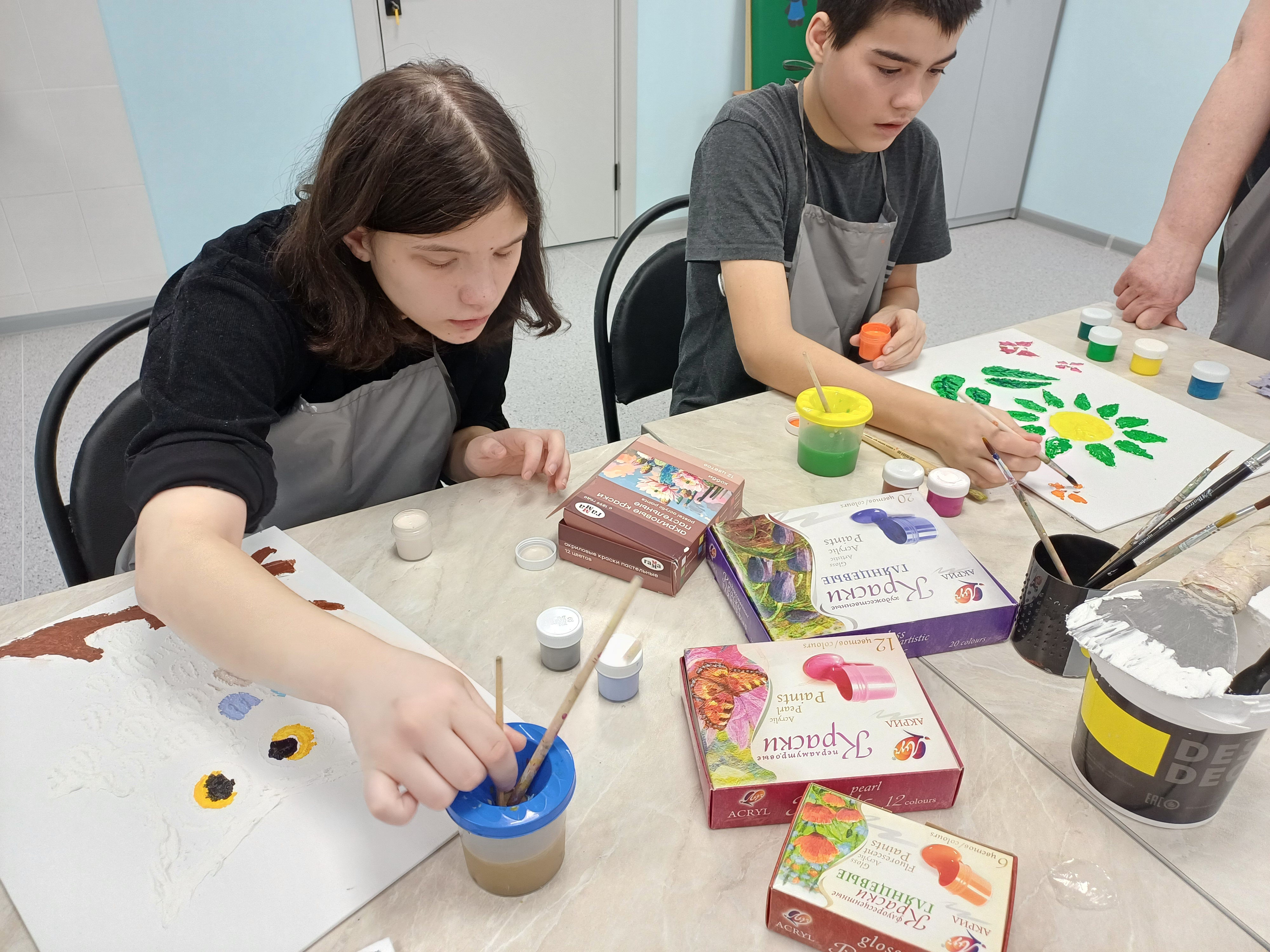 Первые занятия прошли с успехом. Создать полноценный шедевр получилось за 3-4 занятия. У ребят проявился интерес к совместному обсуждению деталей работы, оттенков цвета и др. За работой они успели привыкнуть к другу, сдружиться и раскрылись внутренне.