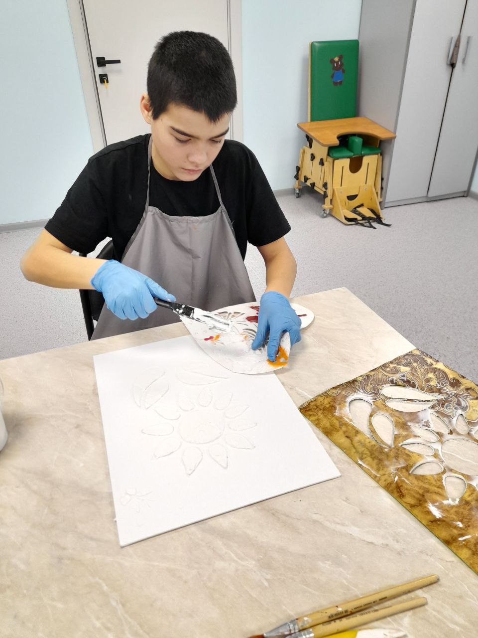 «Техника подходит и для детей в спектре, если при этом они не испытывают неприятных ощущений, — рассказывает инициатор нововведения Елена Анатольевна. — Наша задача — обогащение сенсорного опыта ребенка. Можно работать с пастой даже пальчиками, экспериментировать с поталью, делать акцент в большей мере на абстракцию и минимализм. Можно вообще просто отпечаток ладони сделать».