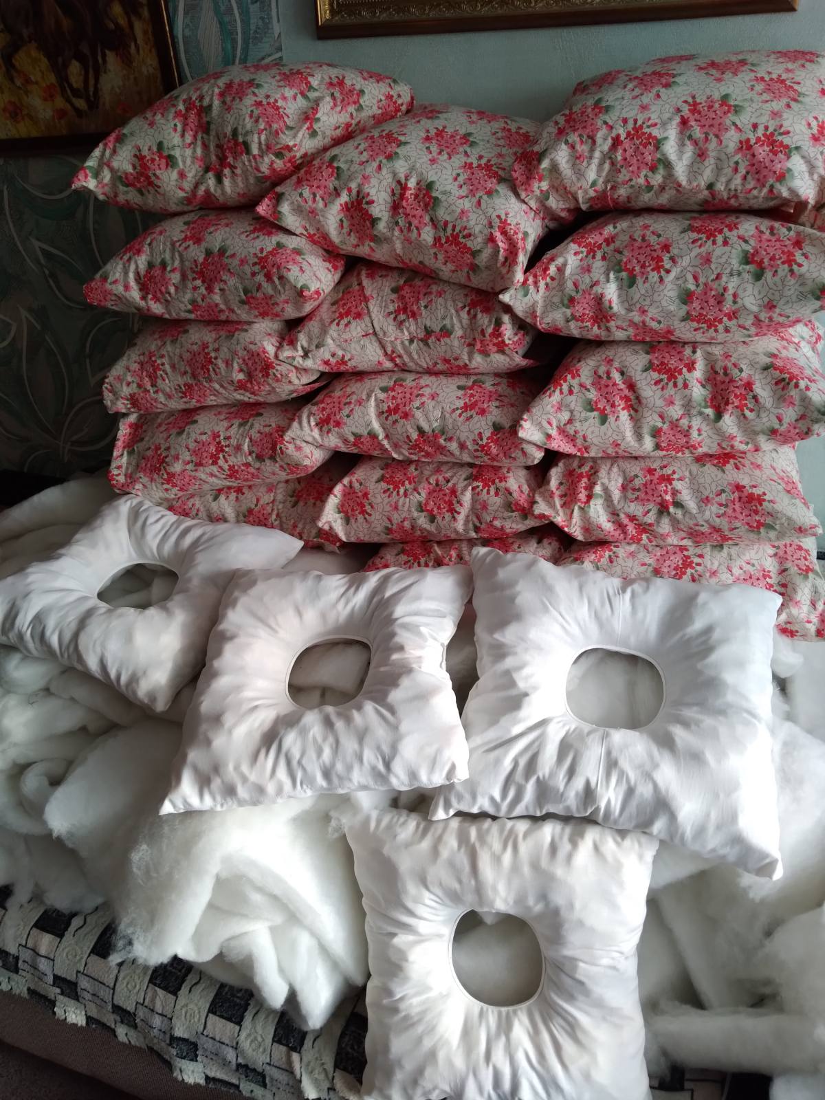 Затем перешла на анатомические подушки 40*40 с отверстием посередине. Они очень удобны для прооперированных, чтоб не задевать больную рану. Для госпиталей они просто необходимы.