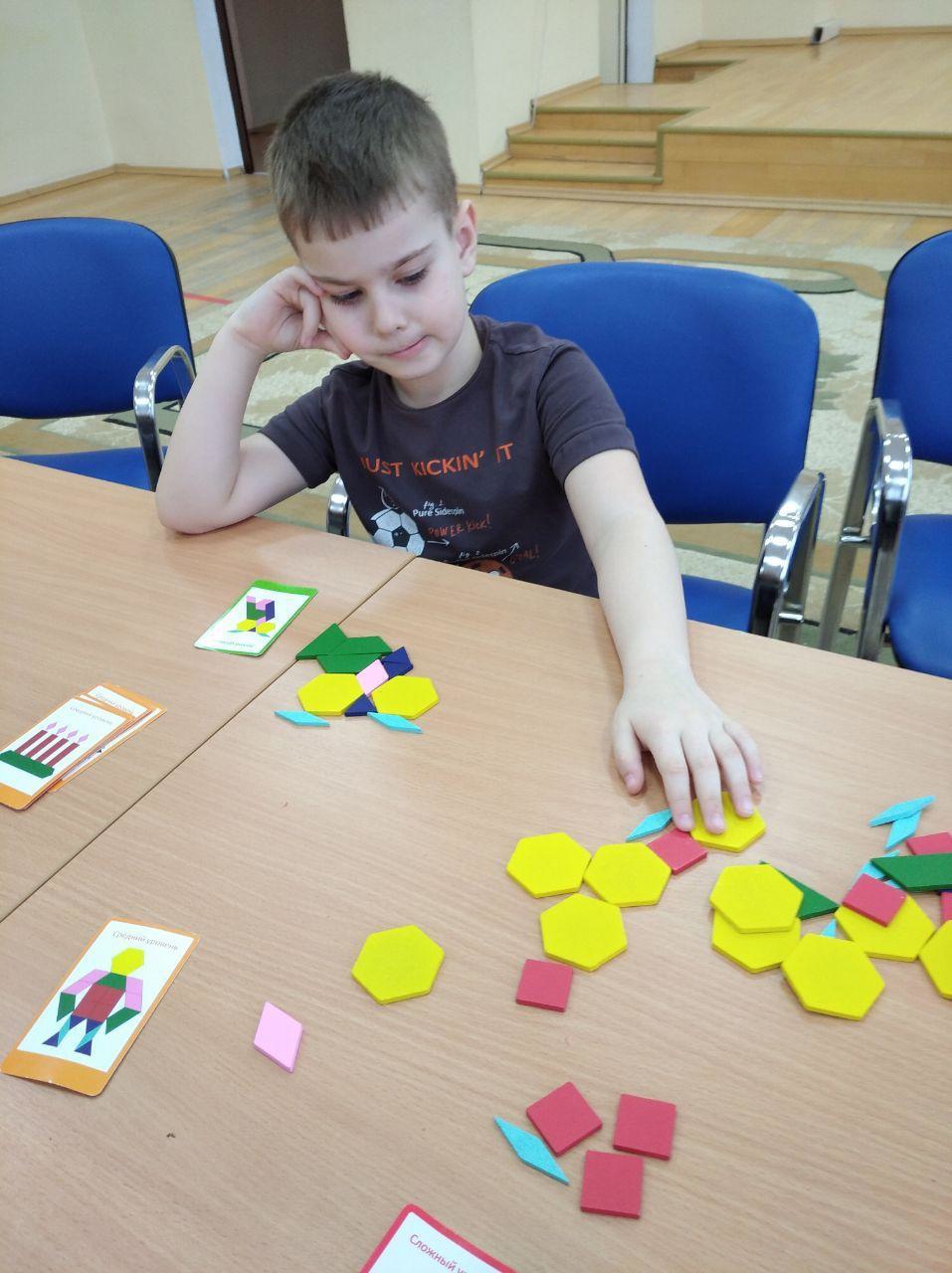 На развивающем занятии социальный педагог Ольга Михайловна Архипова учит ребят геометрическому конструированию.