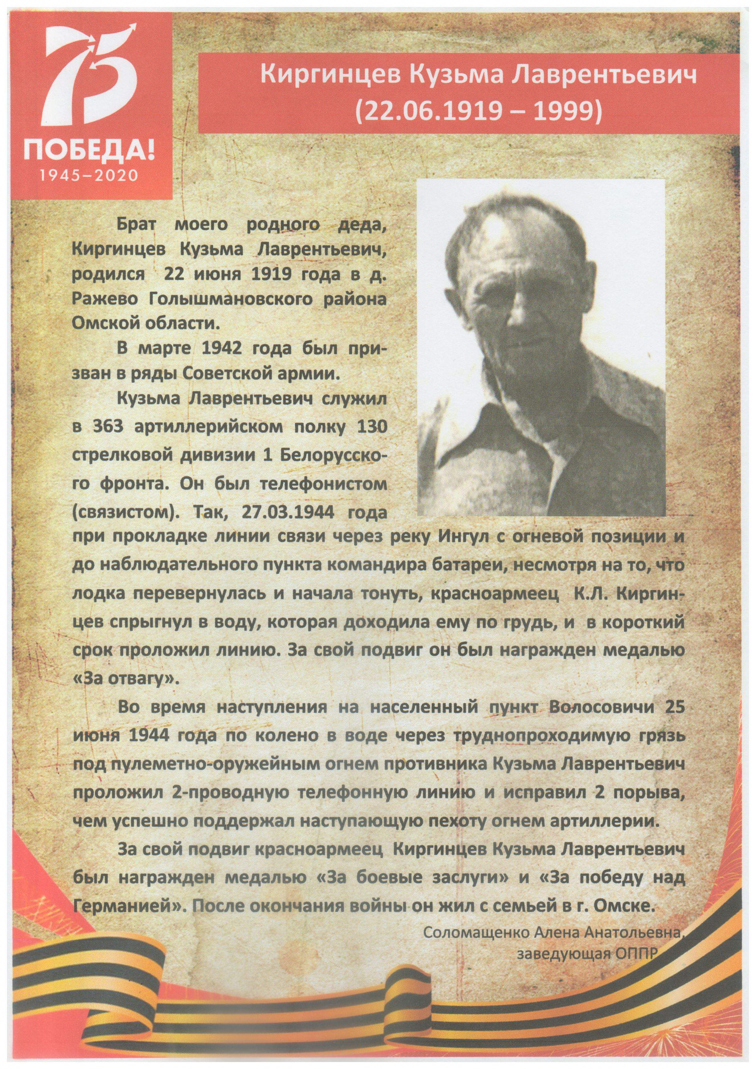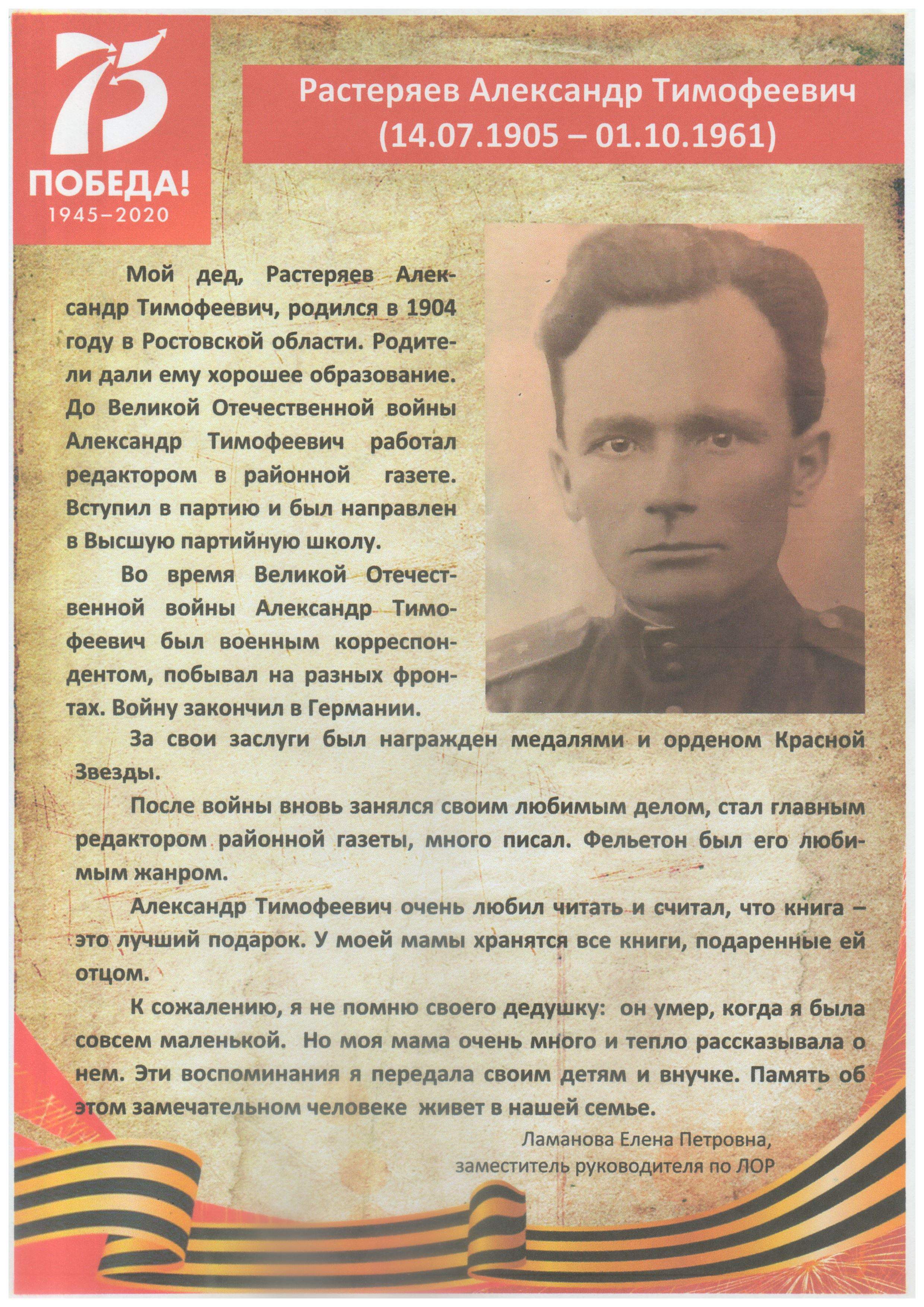 2020 год объявлен Годом памяти и славы в честь 75-летия со дня окончания Великой Отечественной войны. Эта война изменила ход мировой истории, жизни людей и карту мира. В судьбе каждой семьи война оставила свой след.