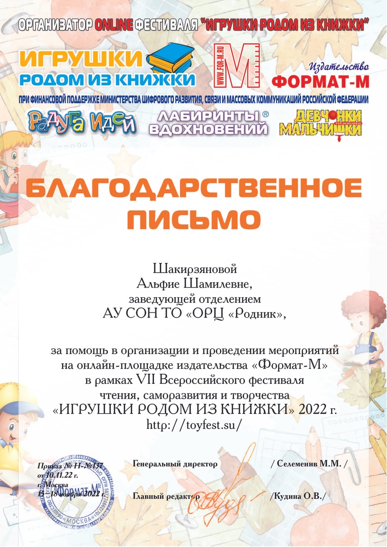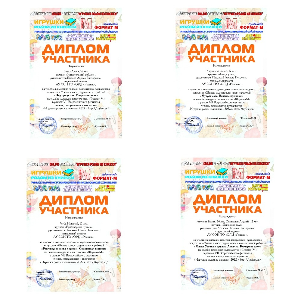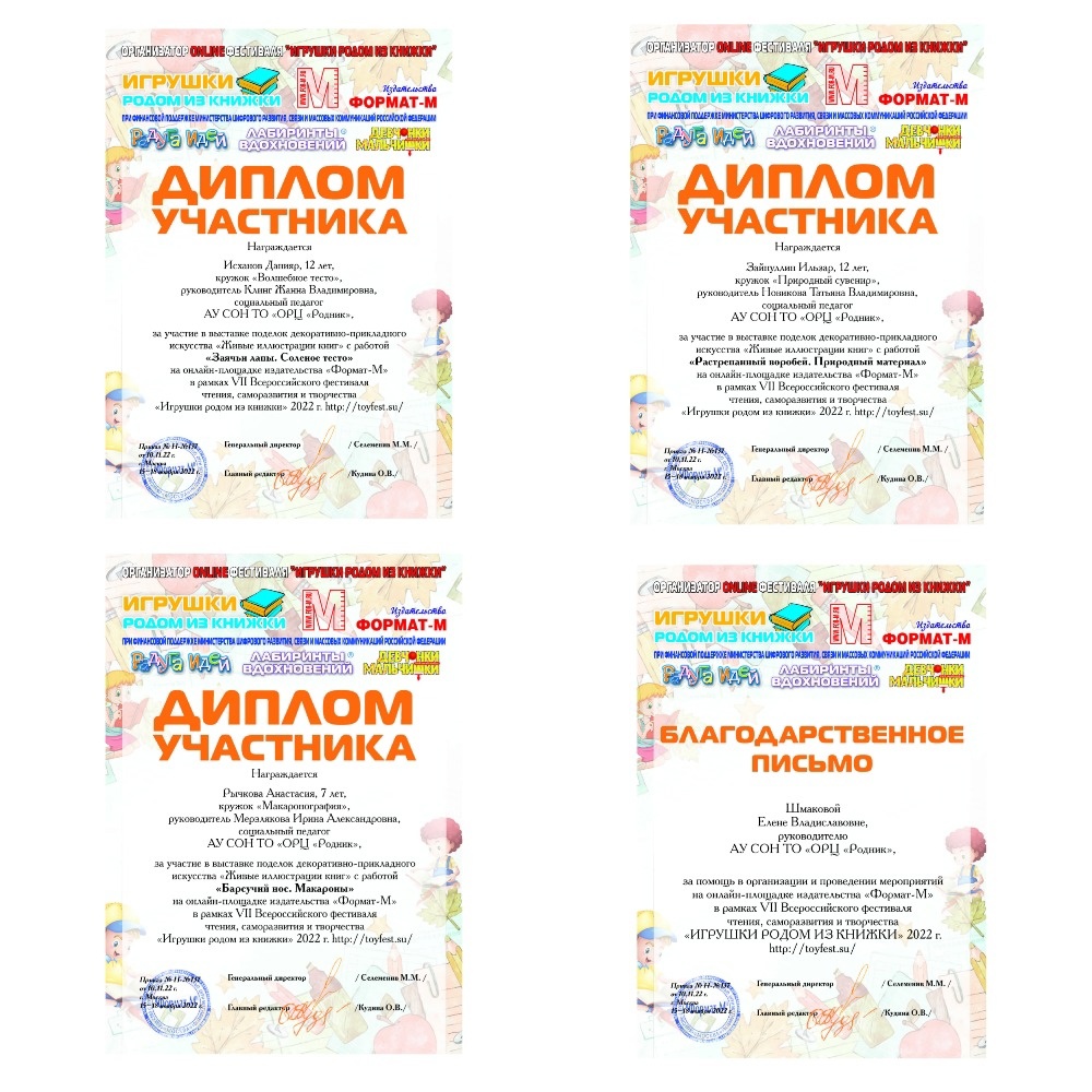 Детские работы, выполненные в мастерских декоративно-прикладного творчества центра «Родник», приняли участие в онлайн-выставке поделок «Живые иллюстрации книг». Выставка состоялась в рамках VII фестиваля детской познавательной, развивающей и прикладной литературы «Игрушки родом из книжки!» - 2022, организованного издательством «Формат-М» при поддержке Министерства цифрового развития, связи и массовых коммуникаций Российской Федерации. Все участники выставки награждены дипломами и благодарственными письмами. Фотографии поделок на выставке «Живые иллюстрации книг» смотрите по ссылке: http://toyfest.su/556/