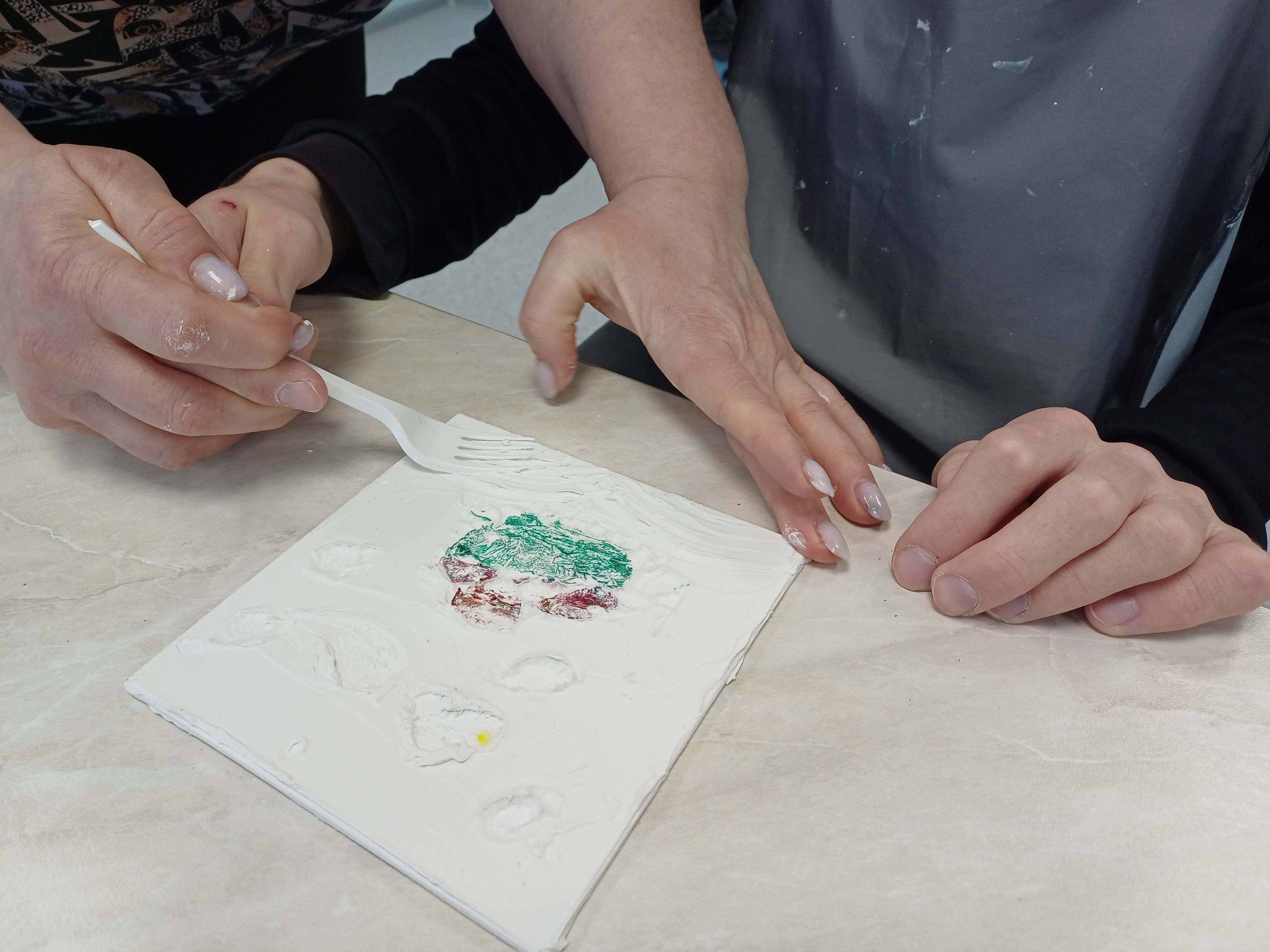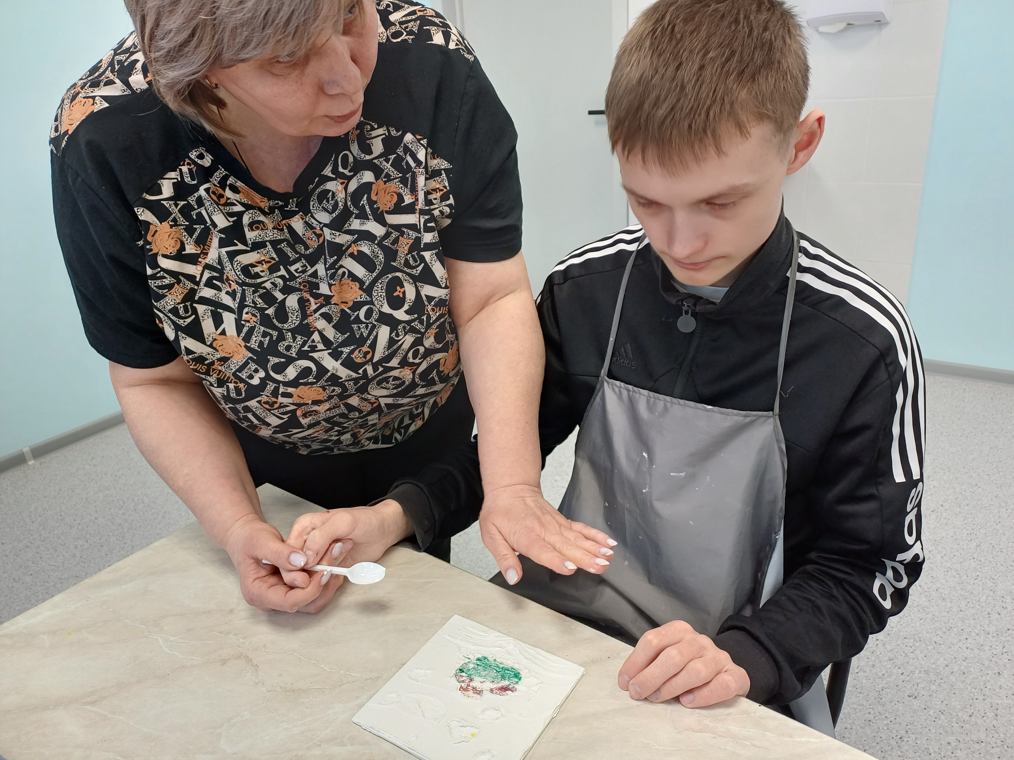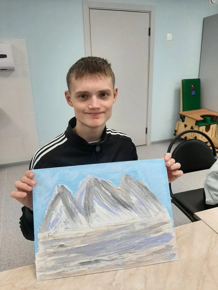 В «Родник» он приехал в последний раз (прим. — льготные путевки по госпрограммам дети с инвалидностью получают до 18 лет). На занятии Кирилл доделывает свой объемный рисунок из текстурной пасты, а педагог Геланова Елена Анатольевна параллельно консультирует подростка и его маму Татьяну по использованию специальных навыков Алисы, чтобы сделать Кирилла более самостоятельным дома.