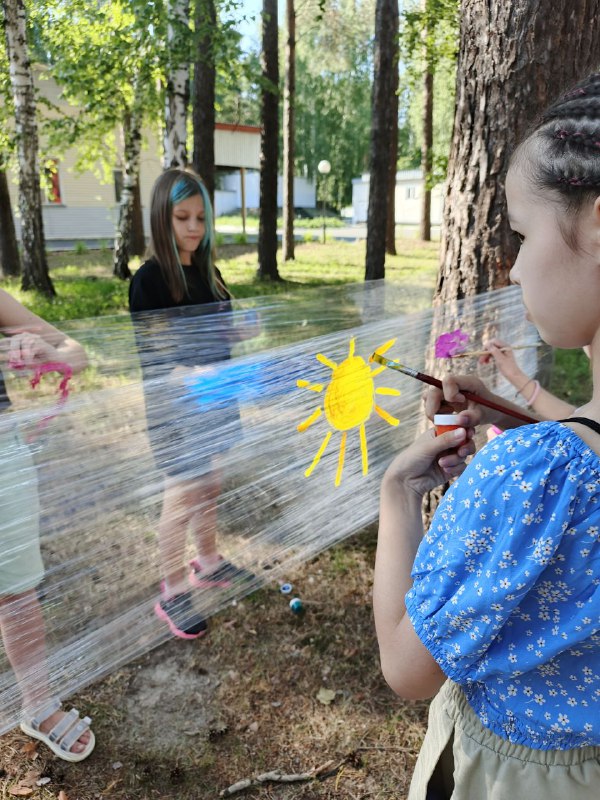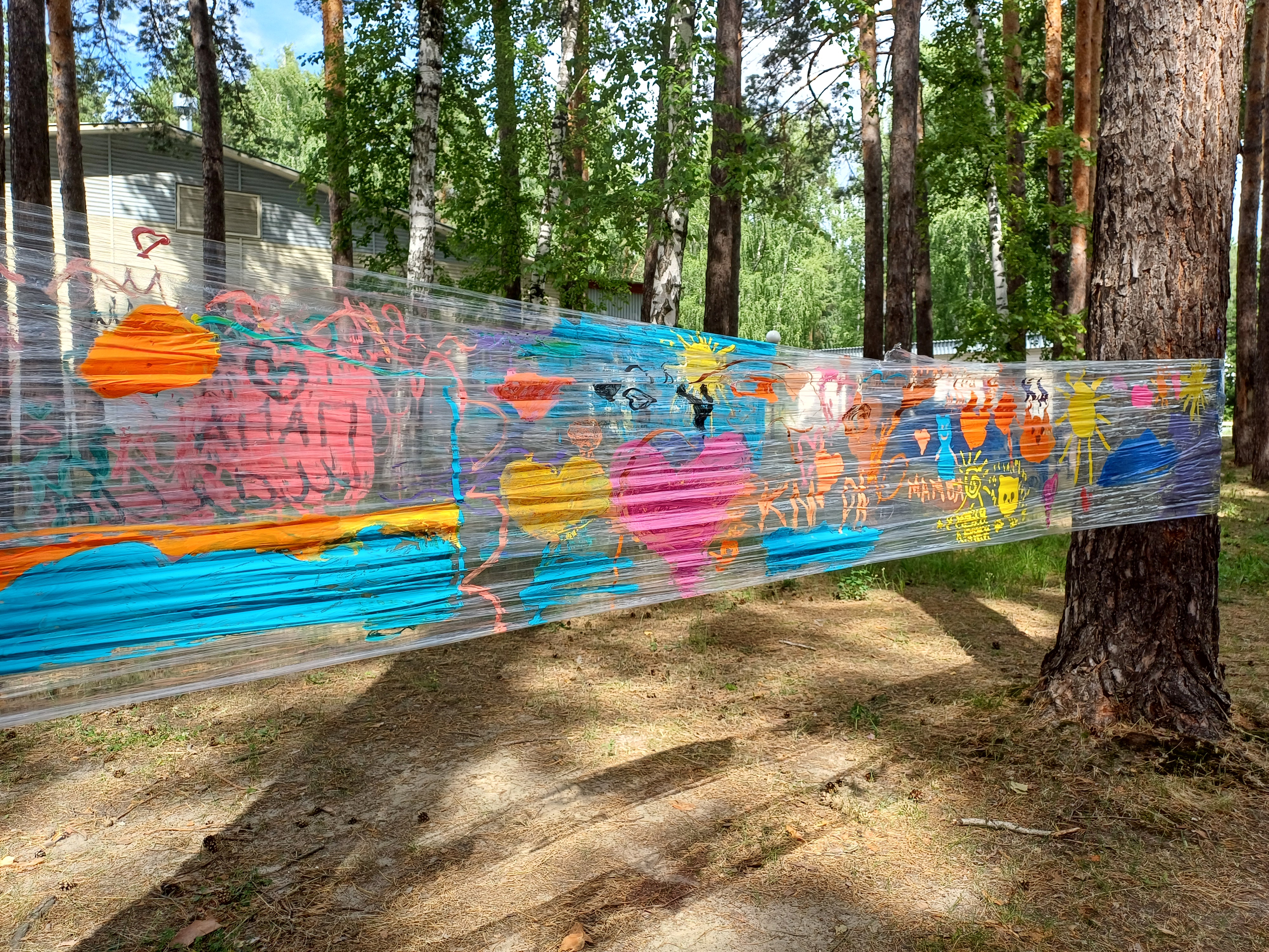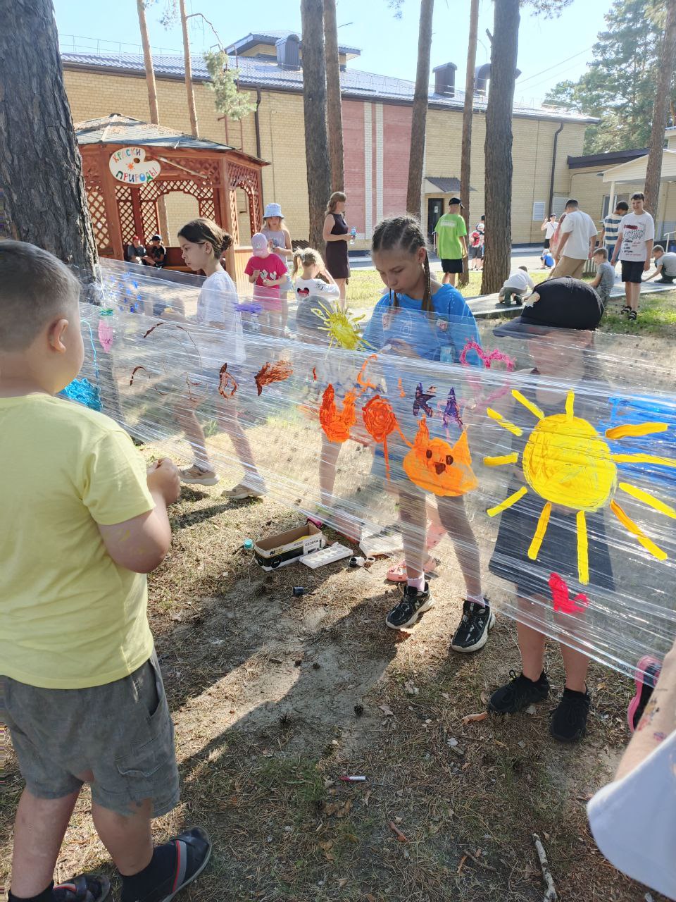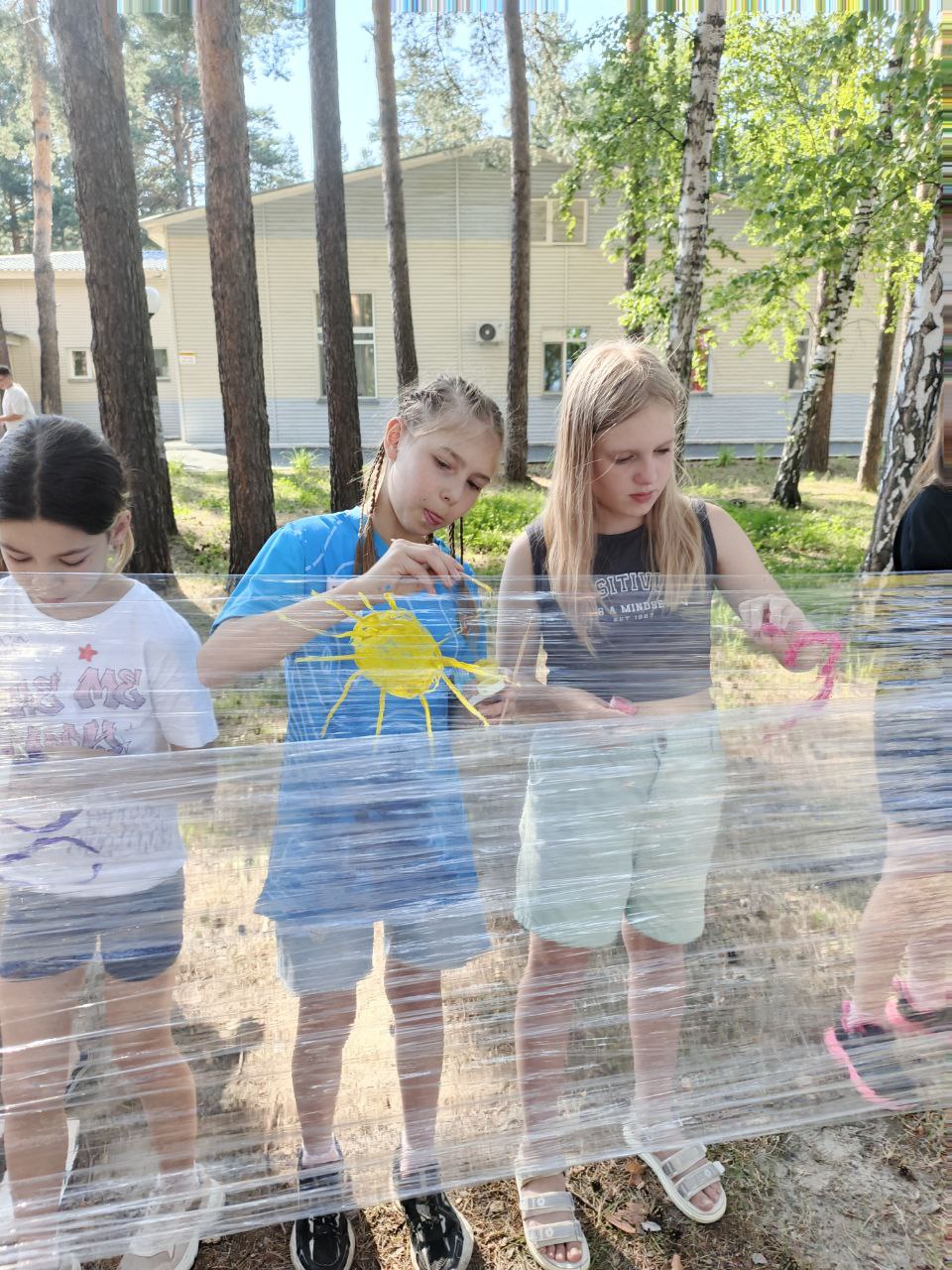 Такой метод арт-терапии предложили педагоги центра Пантелеева Ольга и Миннуллина Кристина. Вместо холста используется прозрачная пленка, натянутая между соснами. В ход идут любые краски и сюжеты.