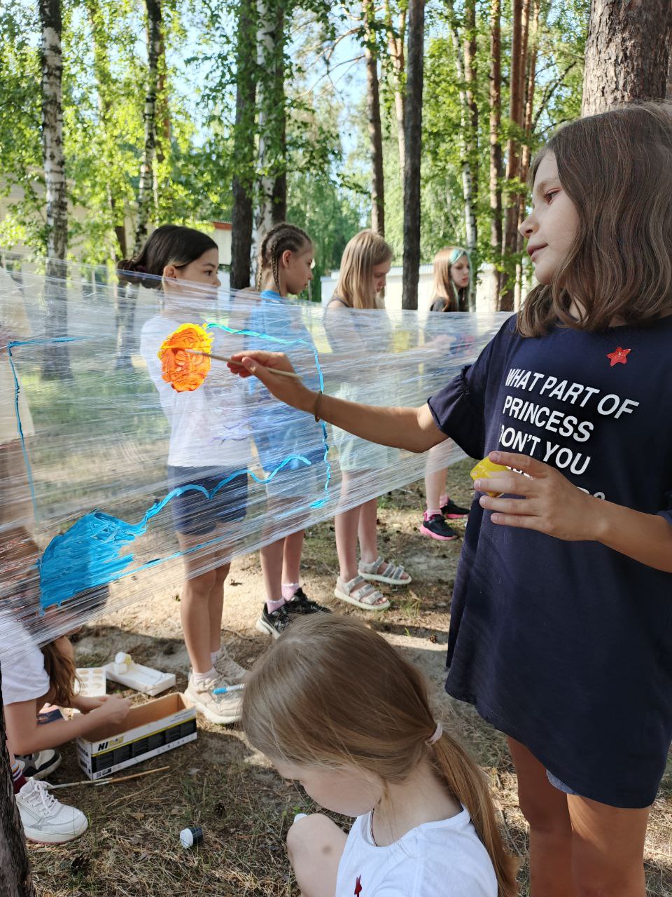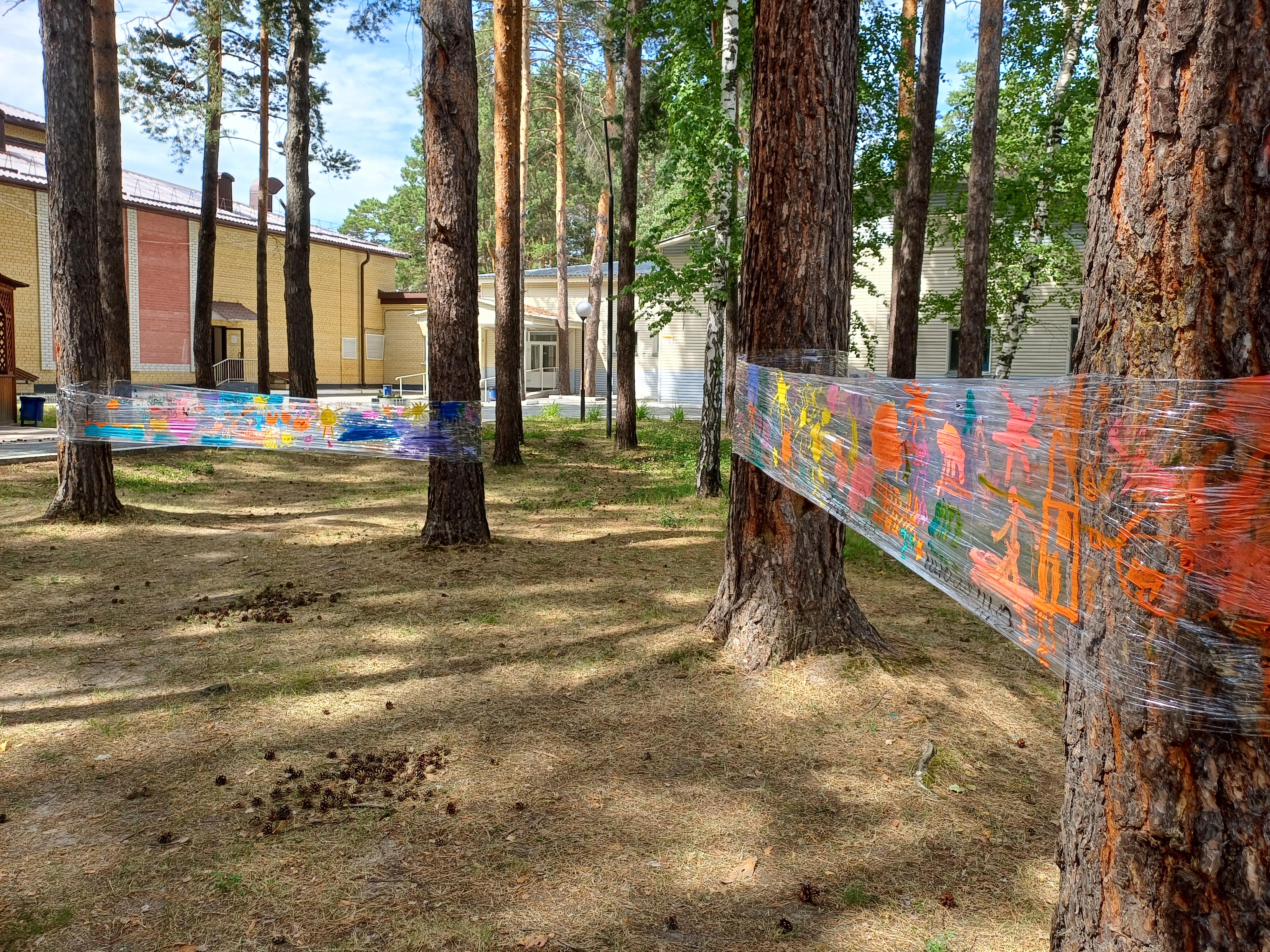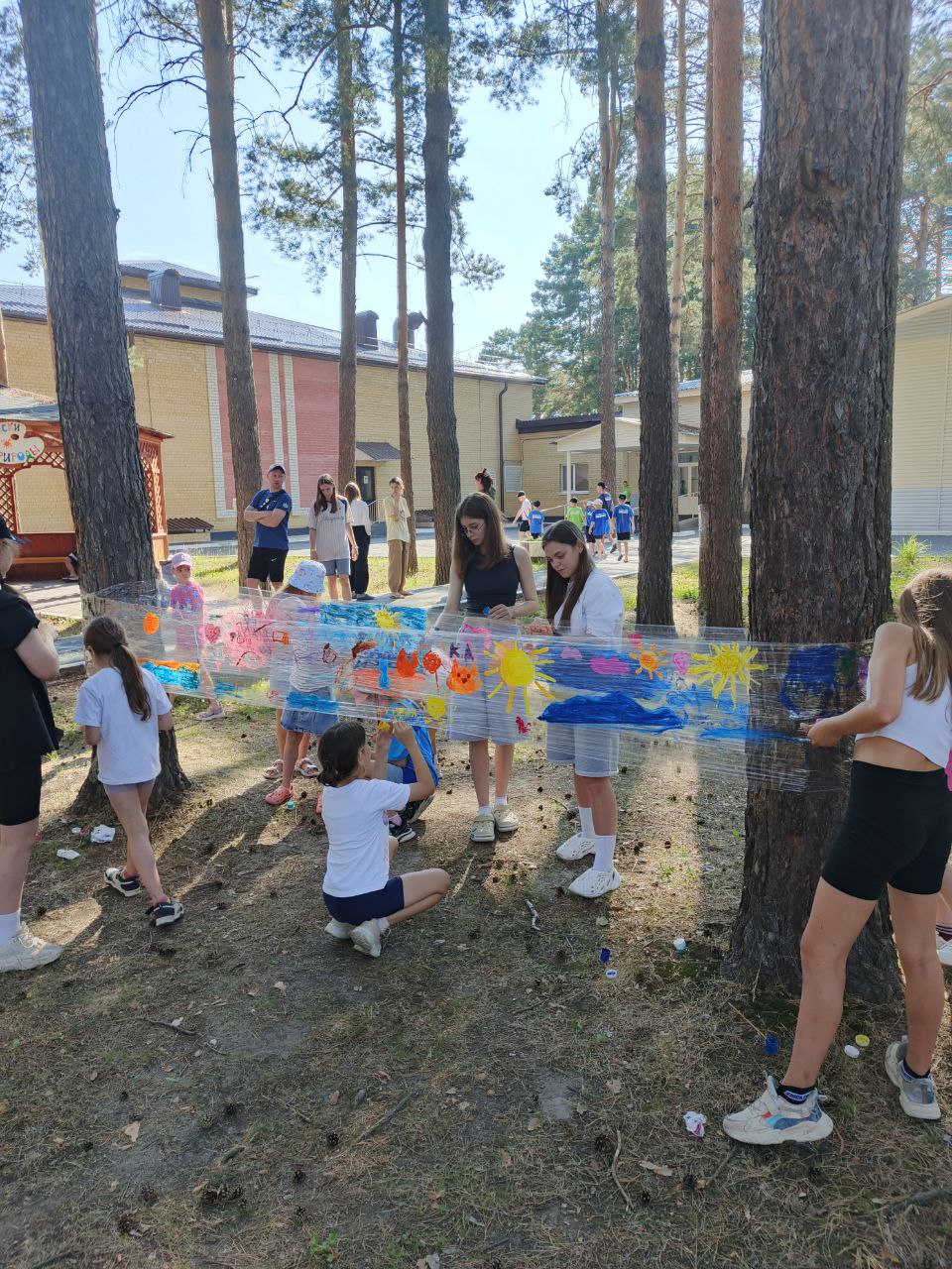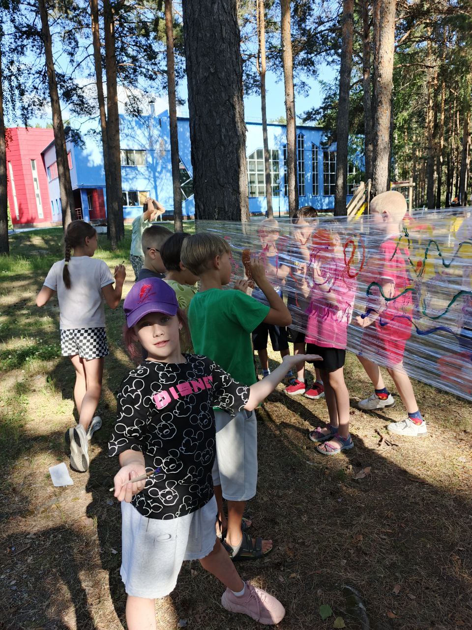 Такой метод арт-терапии предложили педагоги центра Пантелеева Ольга и Миннуллина Кристина. Вместо холста используется прозрачная пленка, натянутая между соснами. В ход идут любые краски и сюжеты.